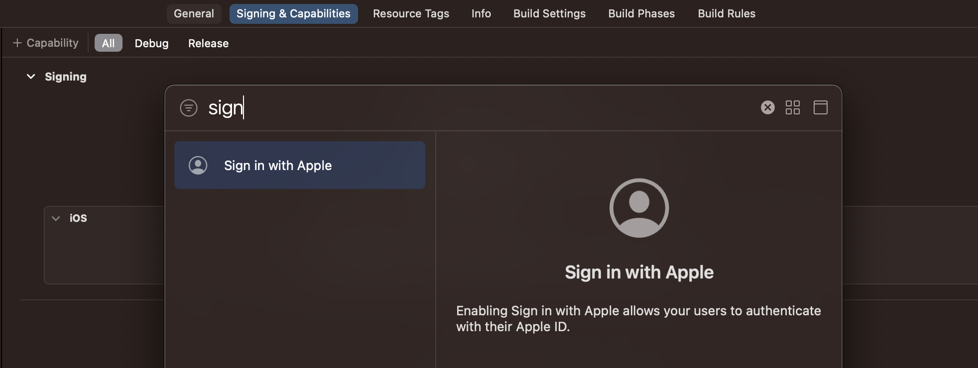 Capabilities에서 Sign In with Apple을 선택하고 저장해준다.