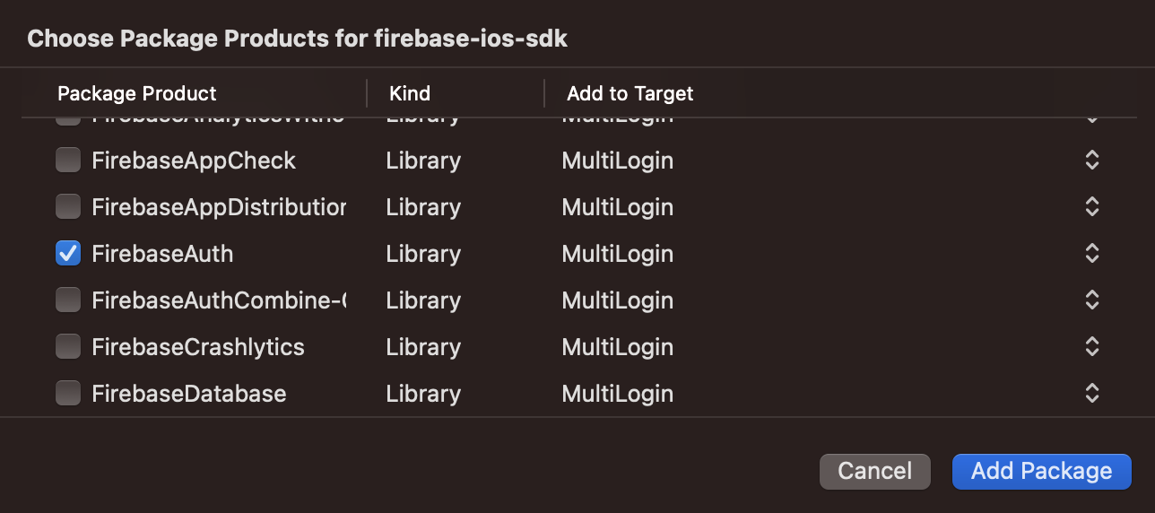 FirebaseAuth를 선택해 Add Packge해준다.