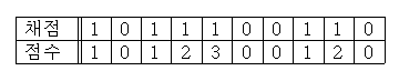 ์๋ฅผ ๋ค์ด, ์๋์ ๊ฐ์ด 10 ๊ฐ์ OX ๋ฌธ์ ์์ ๋ต์ด ๋ง์ ๋ฌธ์ ์ ๊ฒฝ์ฐ์๋ 1๋ก ํ์ํ๊ณ , ํ๋ฆฐ ๊ฒฝ์ฐ์๋ 0์ผ๋ก ํ์ํ์์ ๋, ์ ์ ๊ณ์ฐ์ ์๋ ํ์ ๊ฐ์ด ๊ณ์ฐ๋์ด, ์ด ์ ์๋ 1+1+2+3+1+2=10 ์ ์ด๋ค.